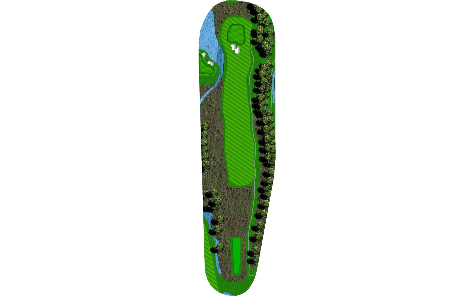 Tee shot through a narrow shoot. Golf balls hit on the left side of the fairway typically will bounce right. The green is narrow and protected by water on the front and a bunker all along the back side.