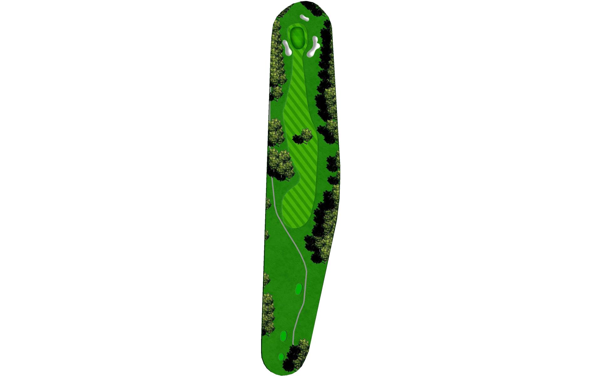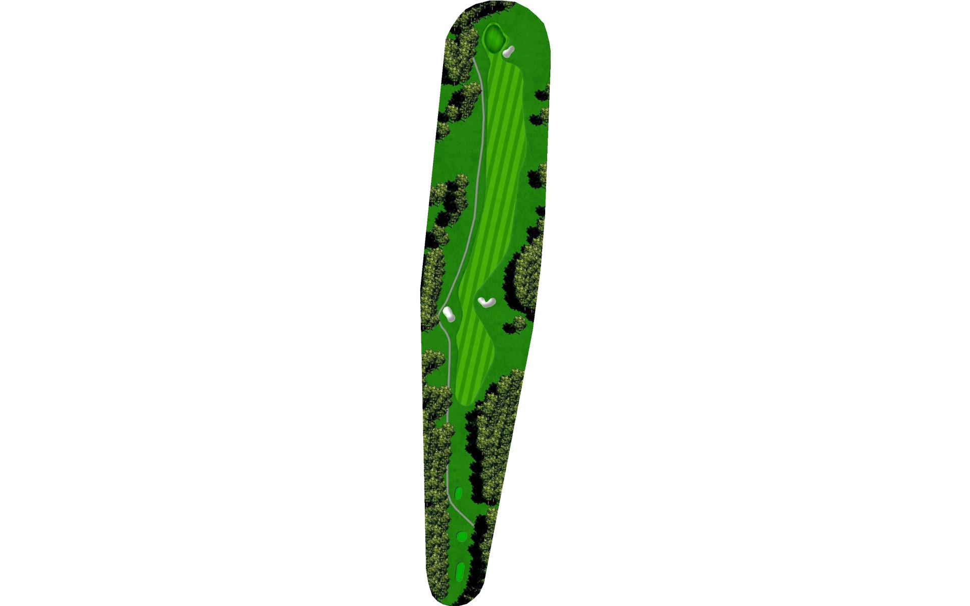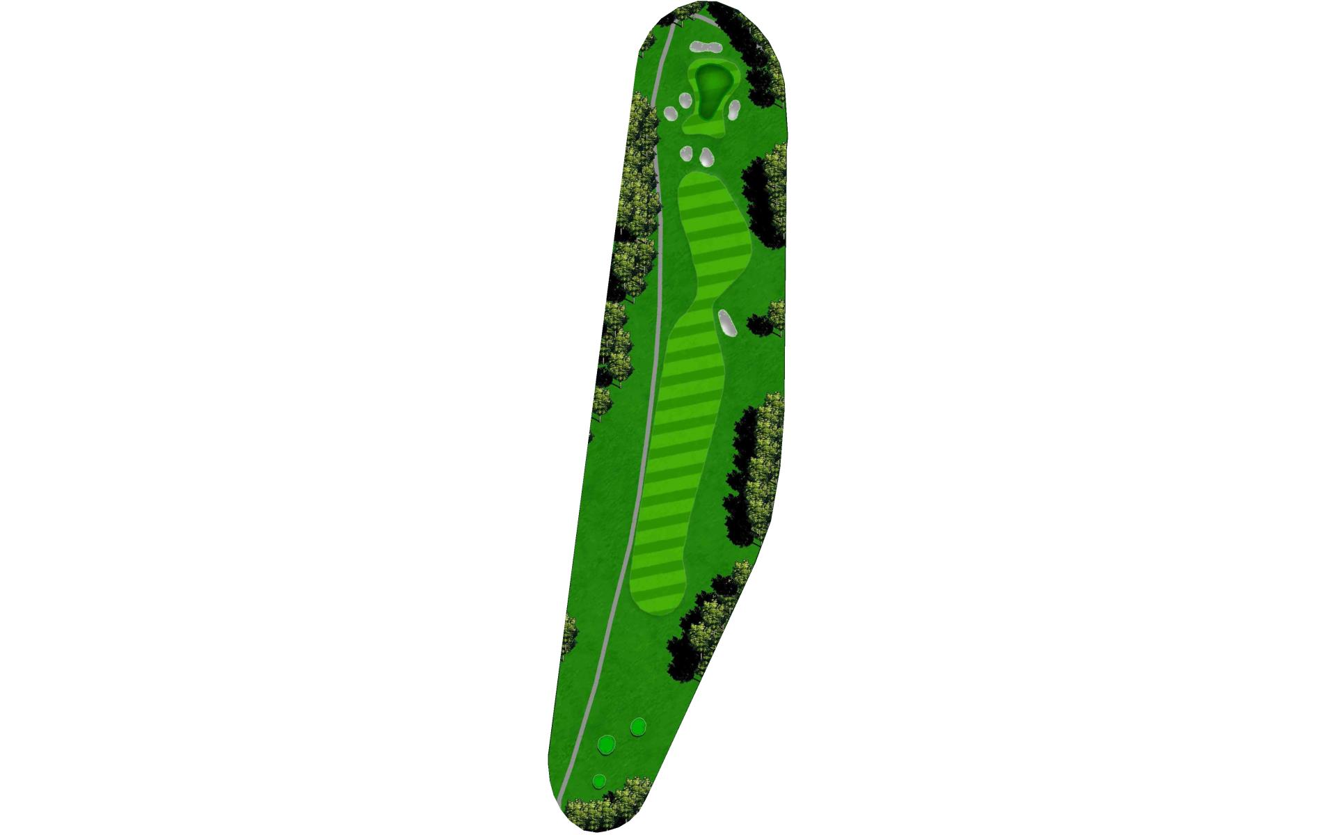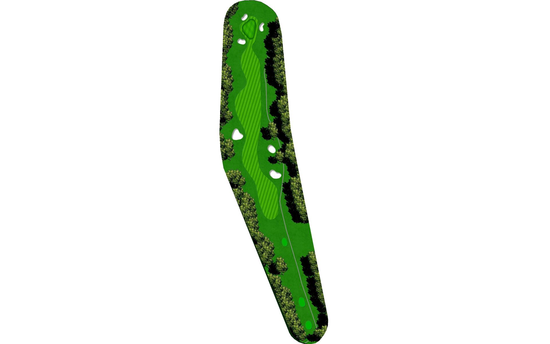 The right side fairway bunkers are 180 yards from the tee and a 230 yard shot is required to carry both bunkers. A tee shot right of the fairway bunkers will generally kick right OB. The left fairway bunker is - 245 yards from the tee. A tee shot up the left side of the fairway will give you a good angle to green with a large slope on the front left portion of the green. Green depth is 34 paces.