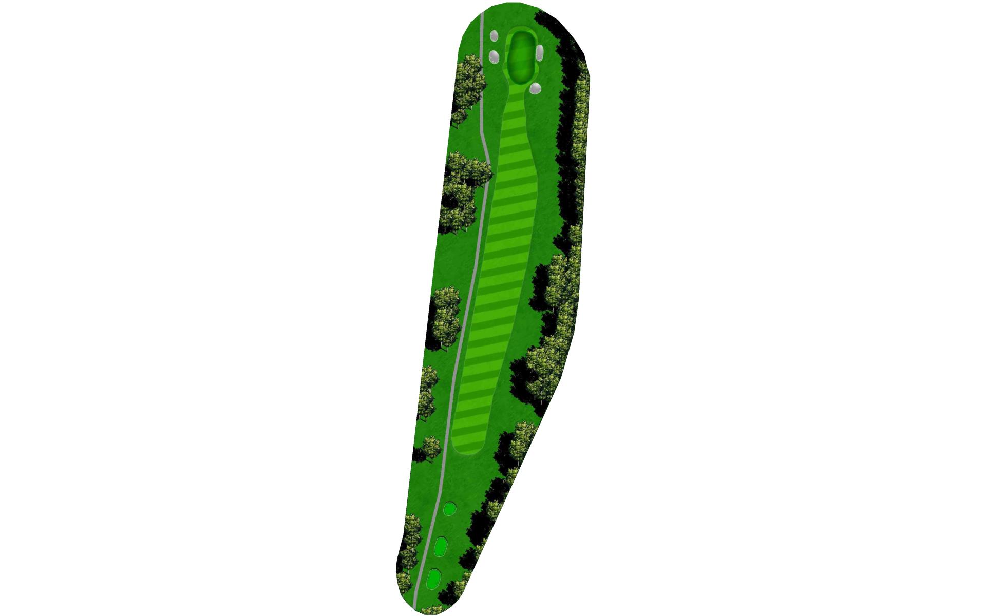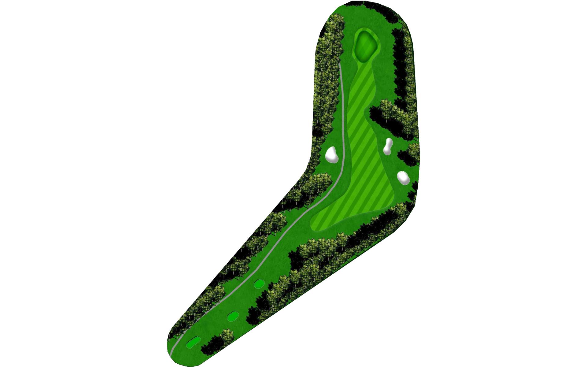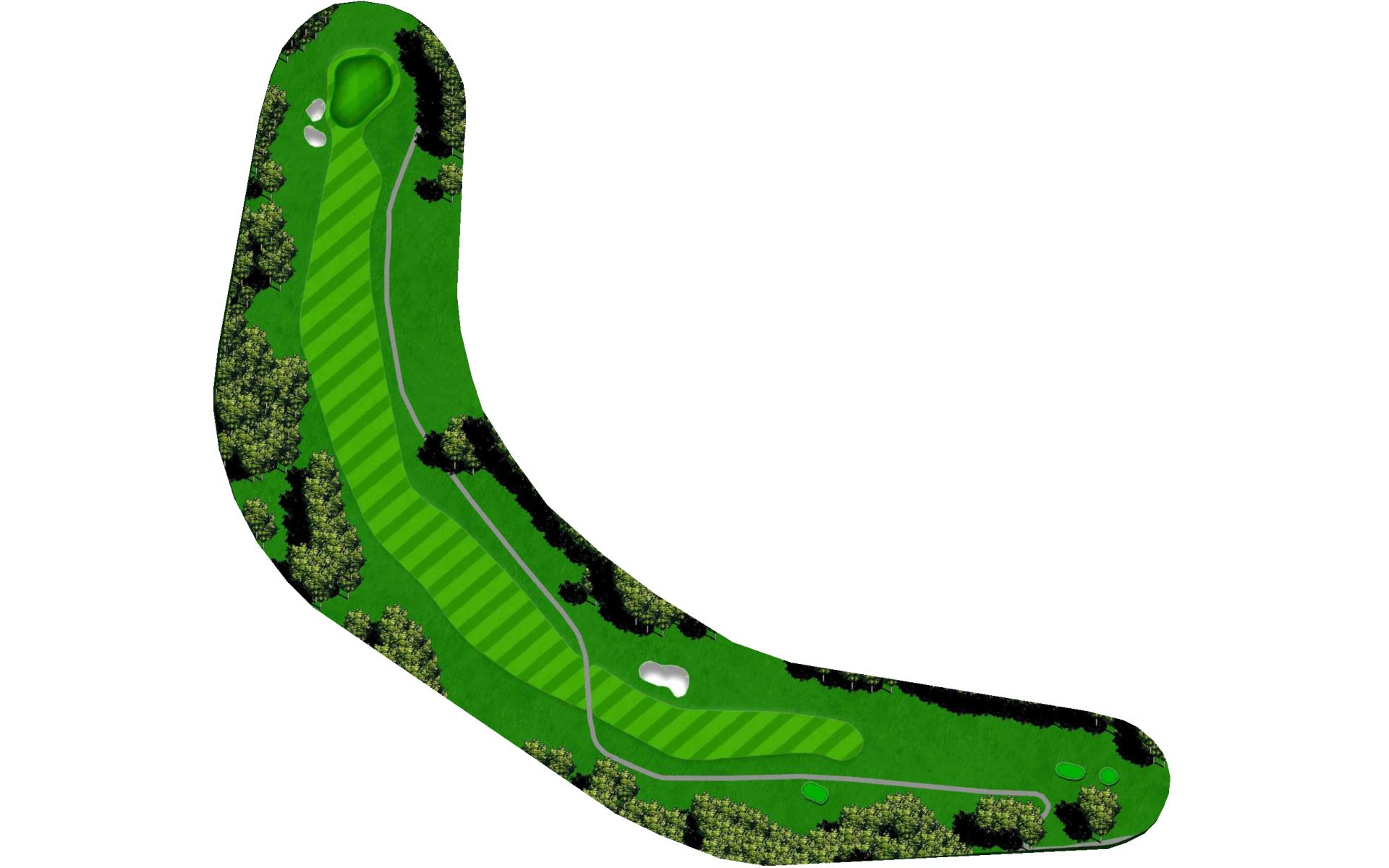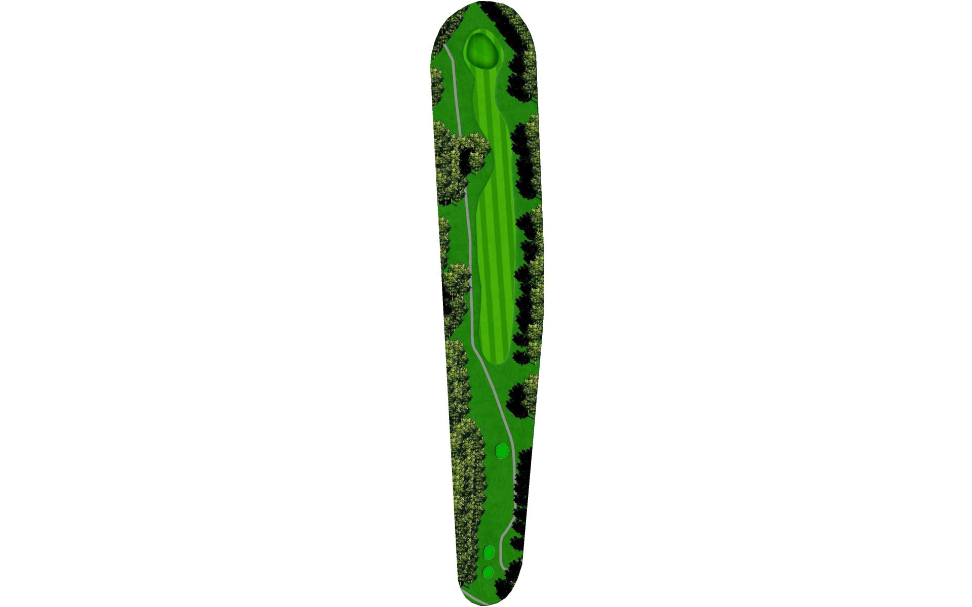 The right side fairway bunkers are 180 yards from the tee and a 230 yard shot is required to carry both bunkers. A tee shot right of the fairway bunkers will generally kick right OB. The left fairway bunker is - 245 yards from the tee. A tee shot up the left side of the fairway will give you a good angle to green with a large slope on the front left portion of the green. Green depth is 34 paces.
