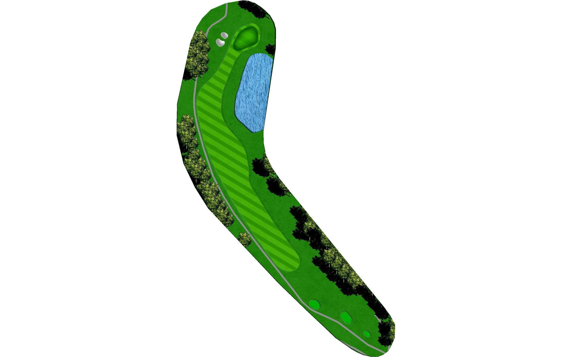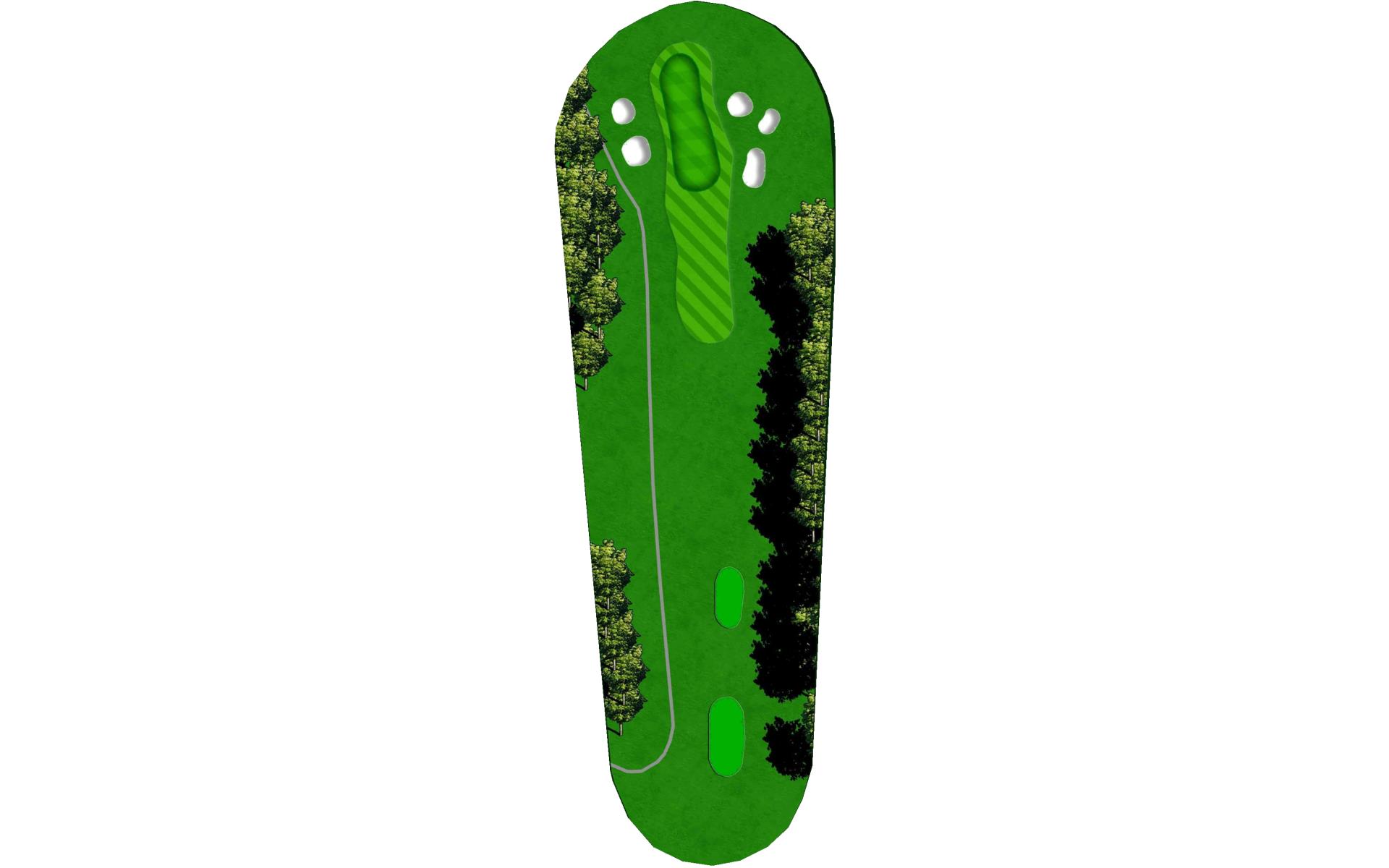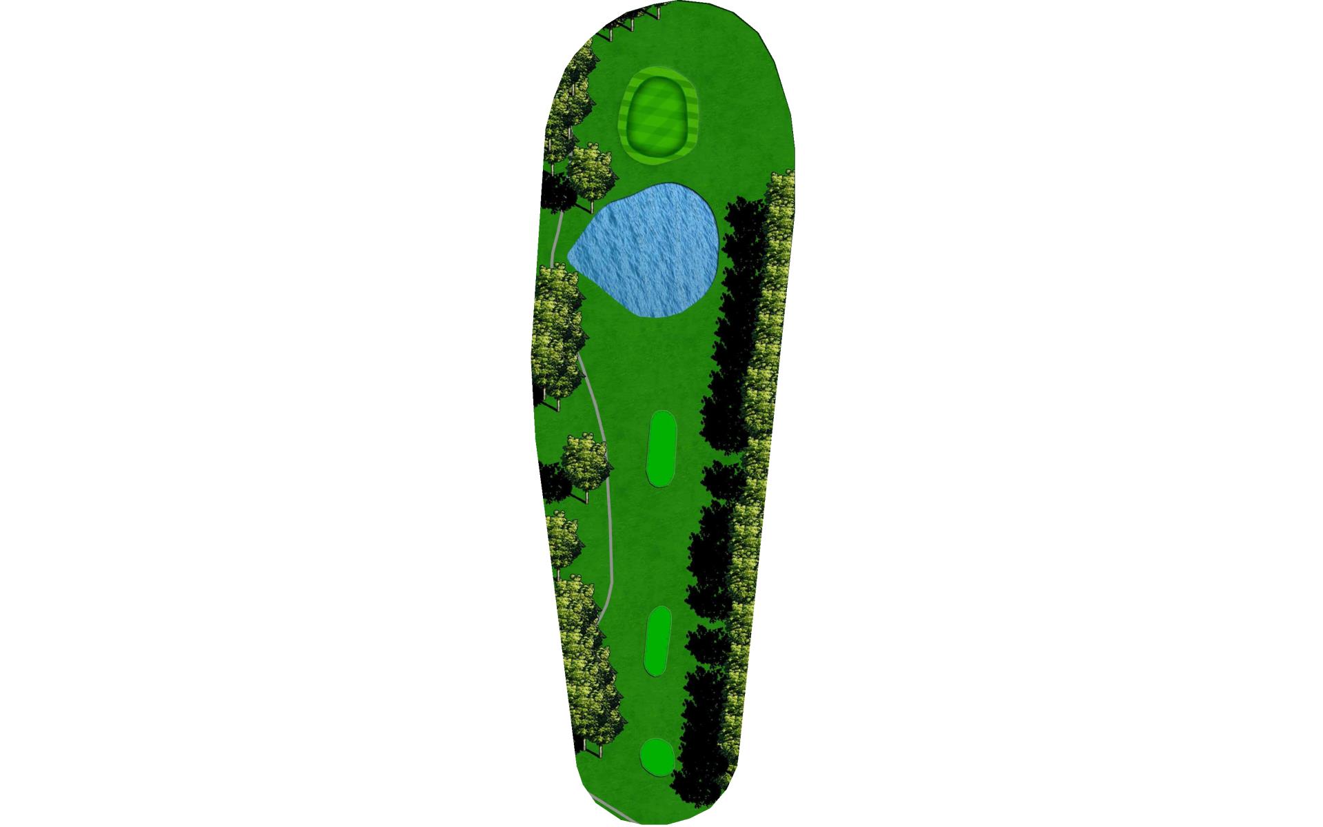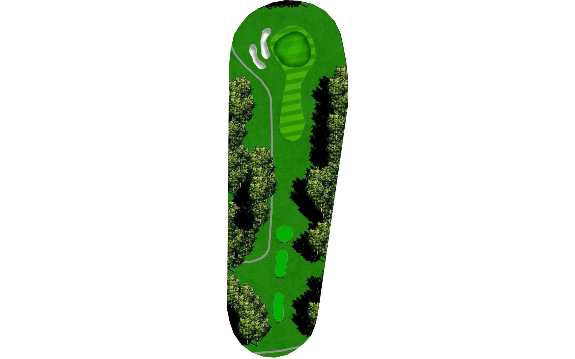The right side fairway bunkers are 180 yards from the tee and a 230 yard shot is required to carry both bunkers. A tee shot right of the fairway bunkers will generally kick right OB. The left fairway bunker is - 245 yards from the tee. A tee shot up the left side of the fairway will give you a good angle to green with a large slope on the front left portion of the green. Green depth is 34 paces.